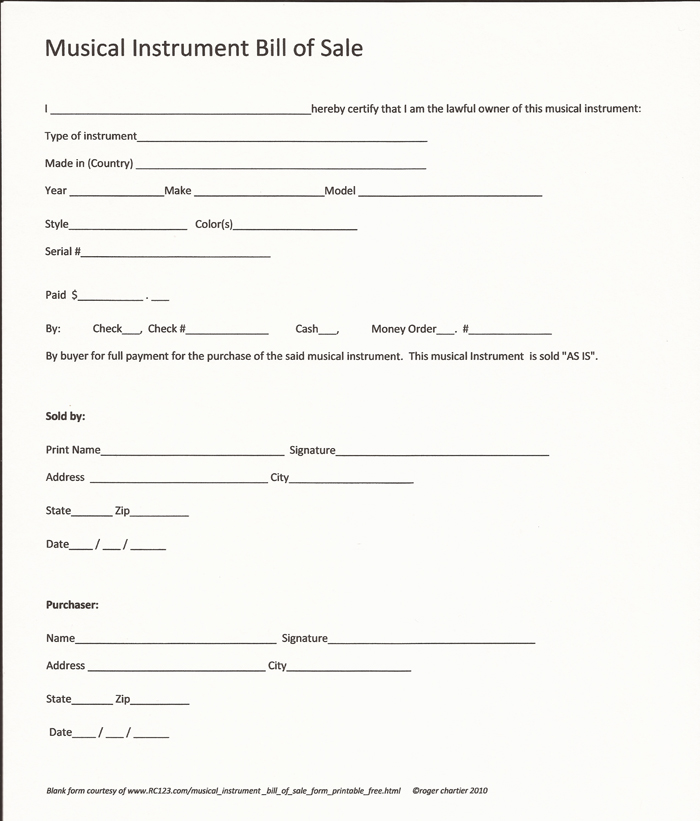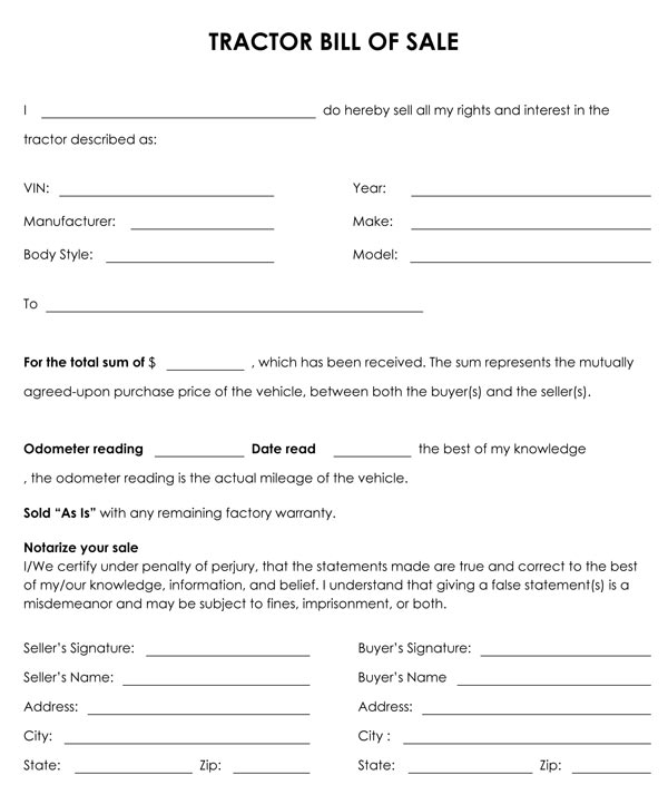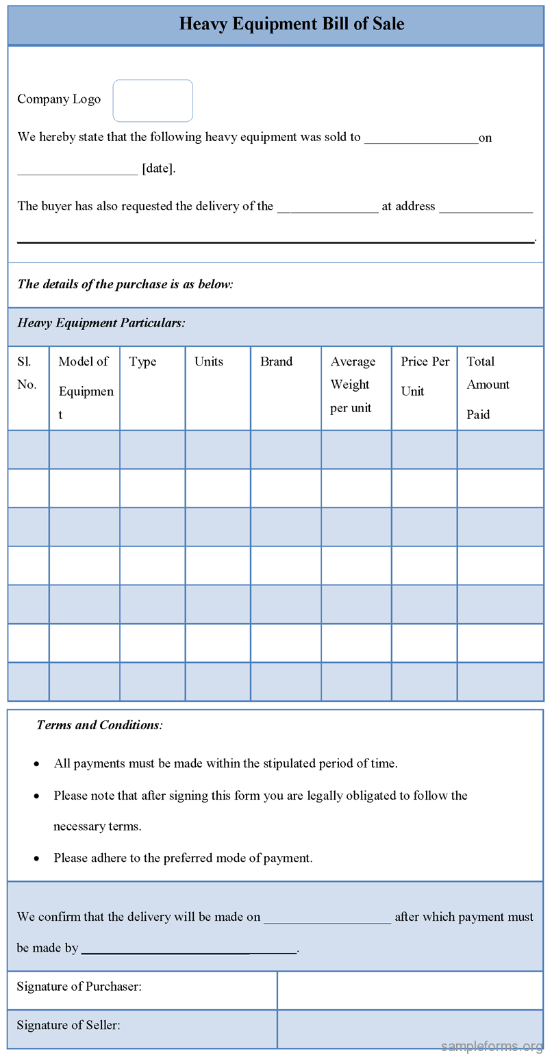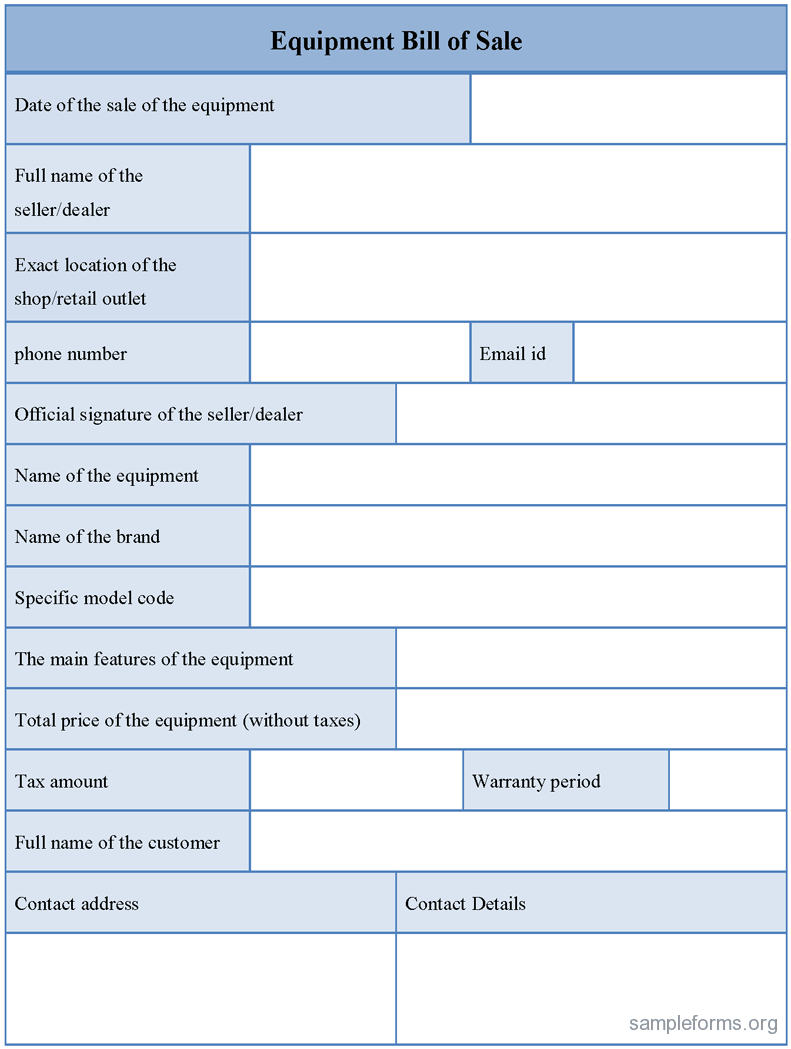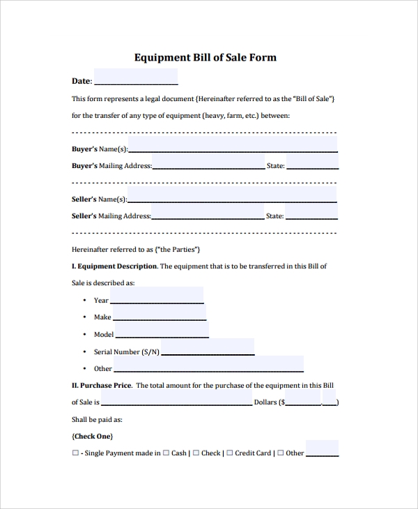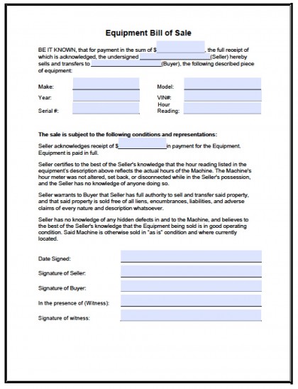 Sample Equipment Bill Of Sale Template