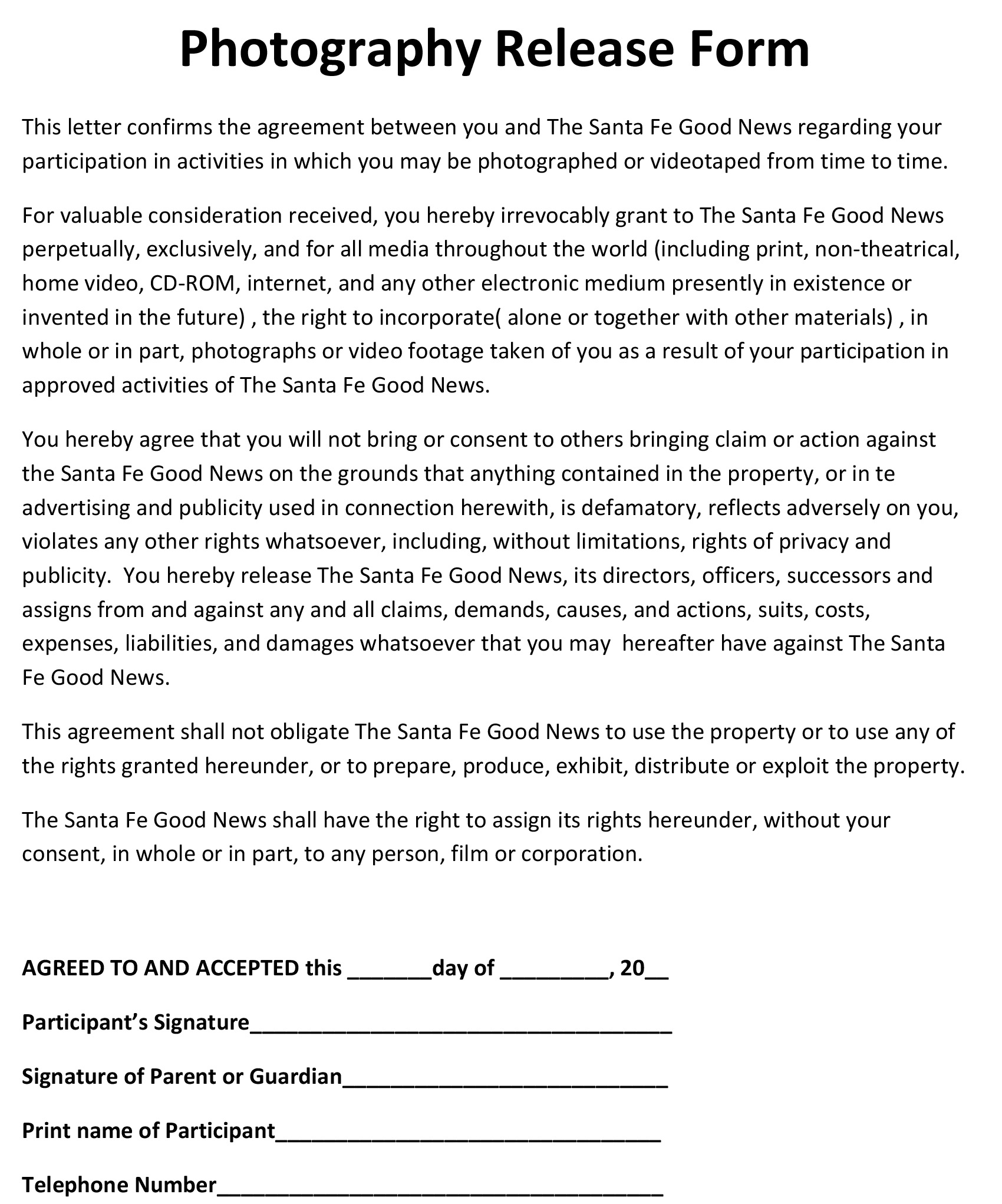 Print Free Photography Release Template from any filetype for instance Otd, Micrsoft Document, Rtf, Zip, Pdf, Google document, Microsoft Docx. Just Print it from our website.