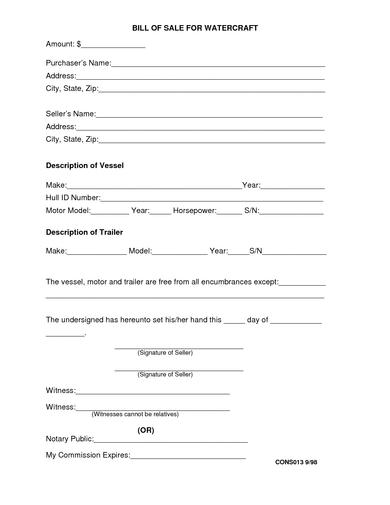 Sample Printable Bill Of Sale For Travel Trailer